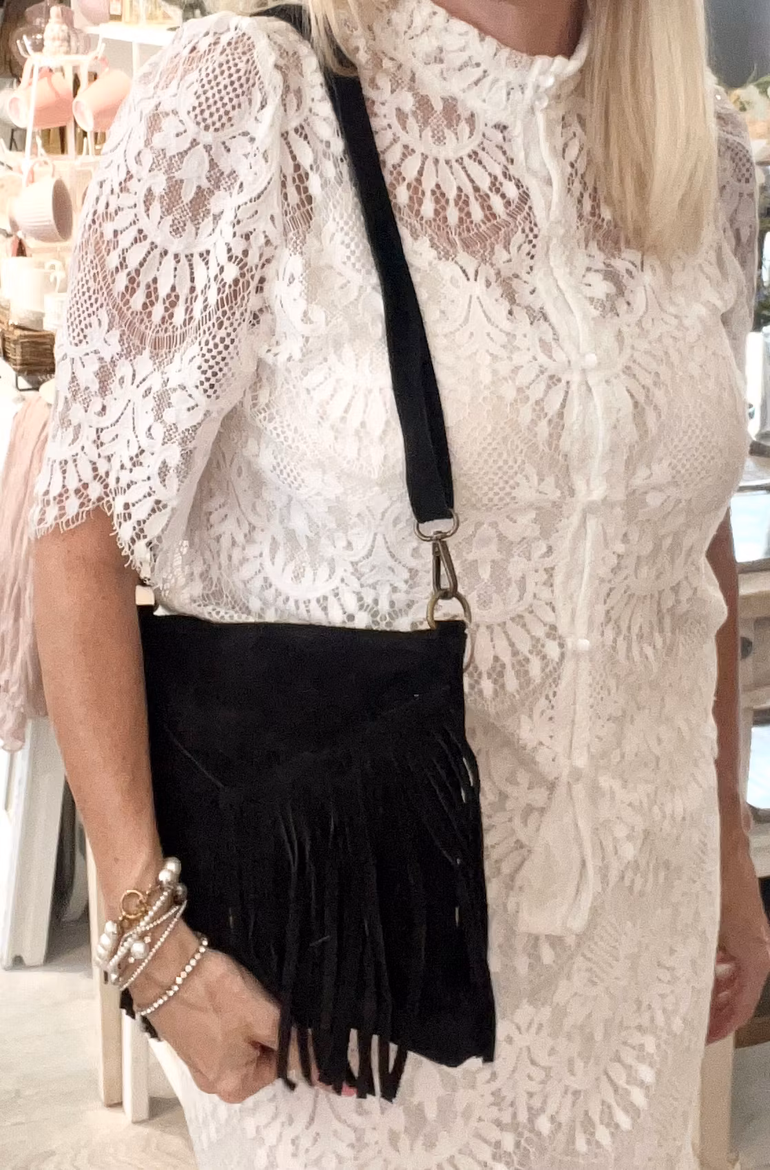 Hem › Accessoarer › Väskor › Mockaväska Austin svart Mockaväska Austin svart I lager. 0 kr 599 kr Jättesnygg mockaväska med fransar ca 26x23cm. Fransar på framsidan, dragkedja upptill och stängbart fack inuti. Justerbar axelrem