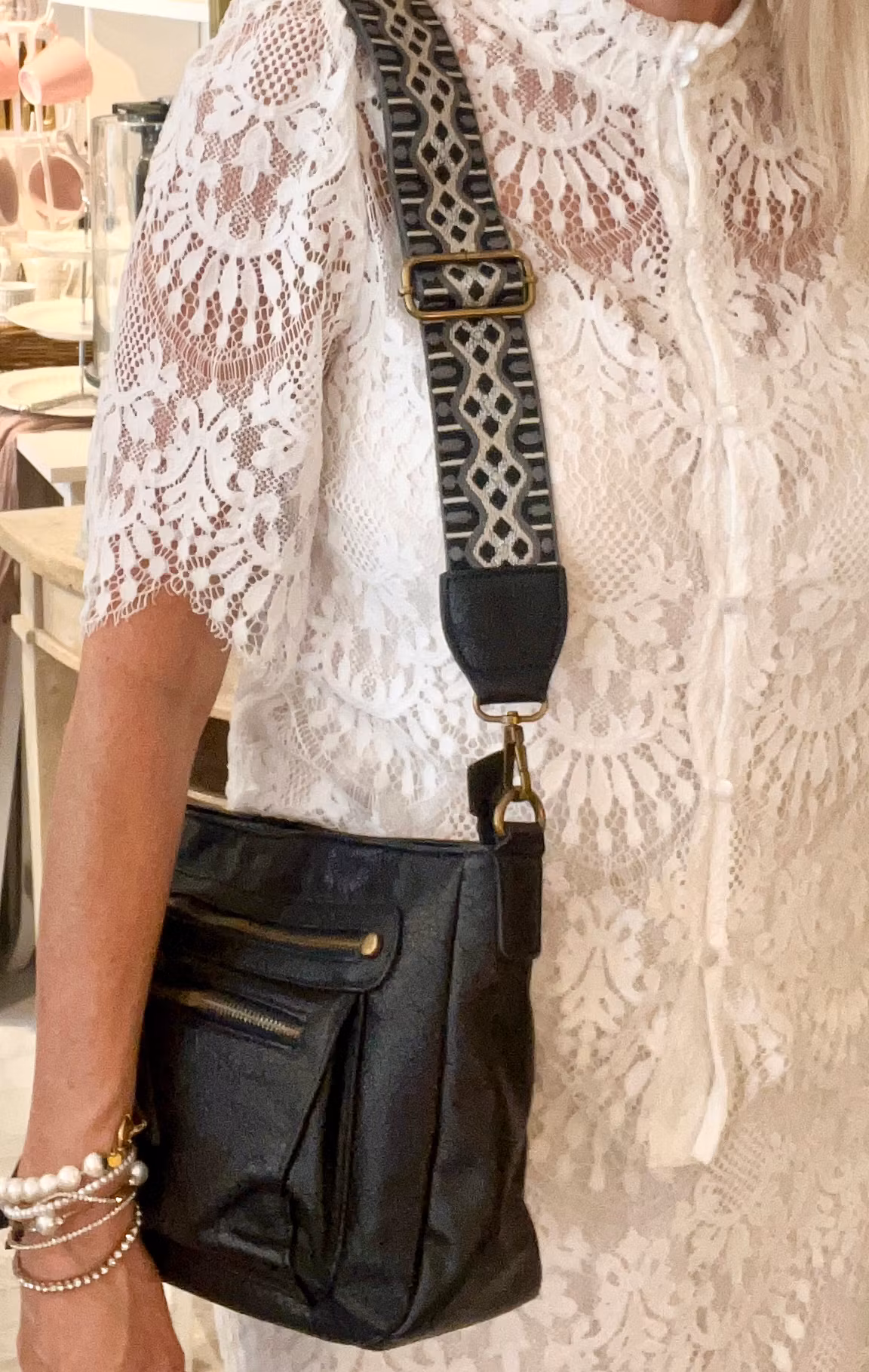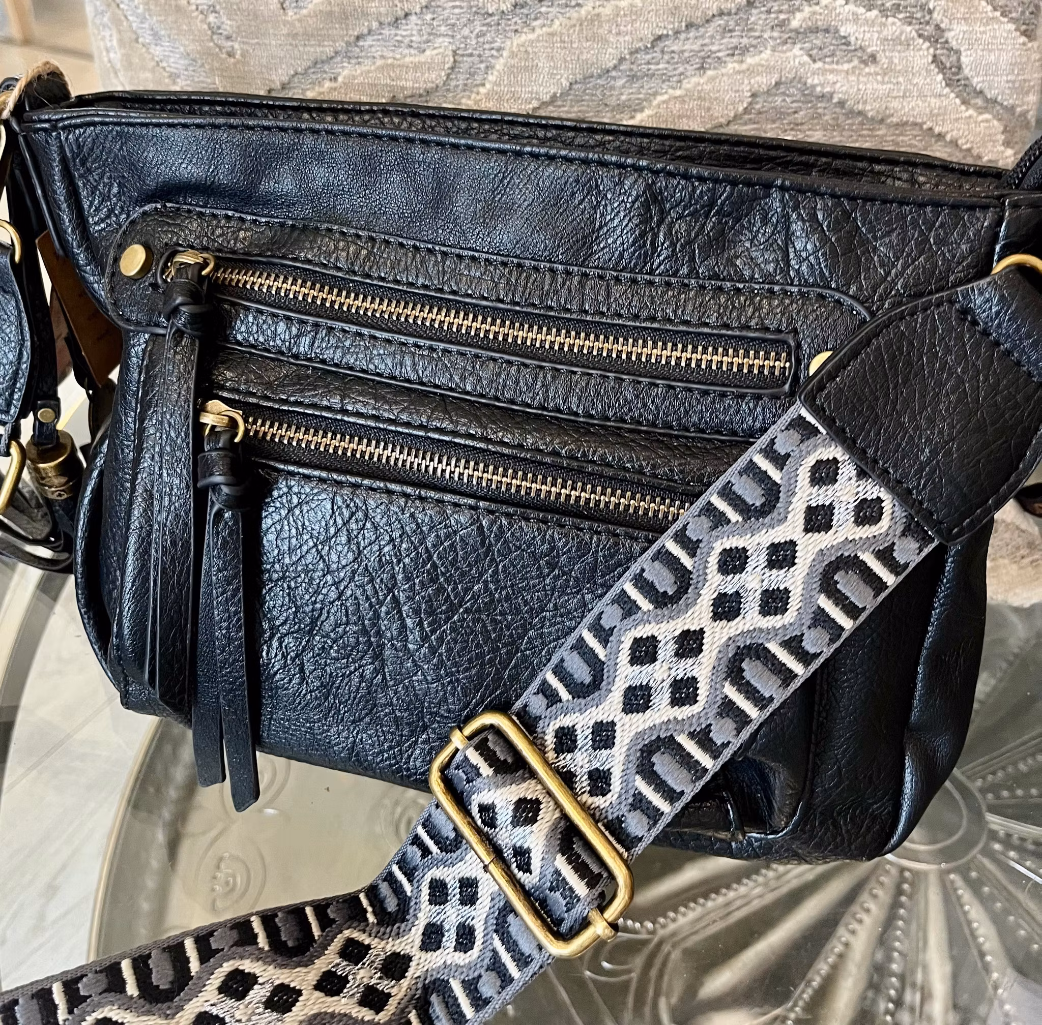 Jättesnygg väska i fuskskinn som ser ut som riktigt skinn. Justerbart mönstrat axelband samt även enfärgat axelband. Avtagbar tofs