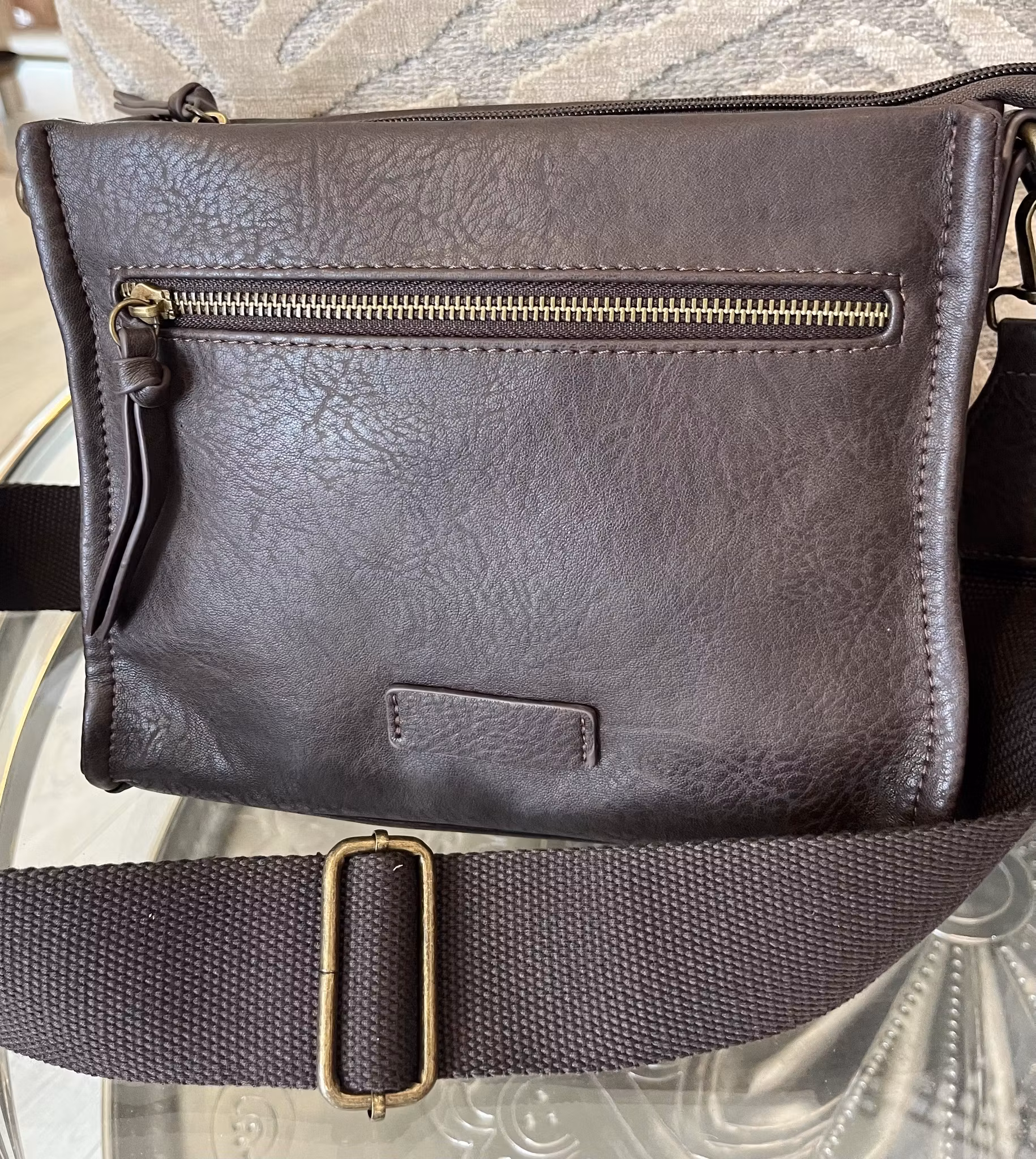 Jättesnygg väska i fuskskinn som ser ut som riktigt skinn. Justerbar bredare axelrem och stängbart fack på både framsidan och baksidan samt inuti.
