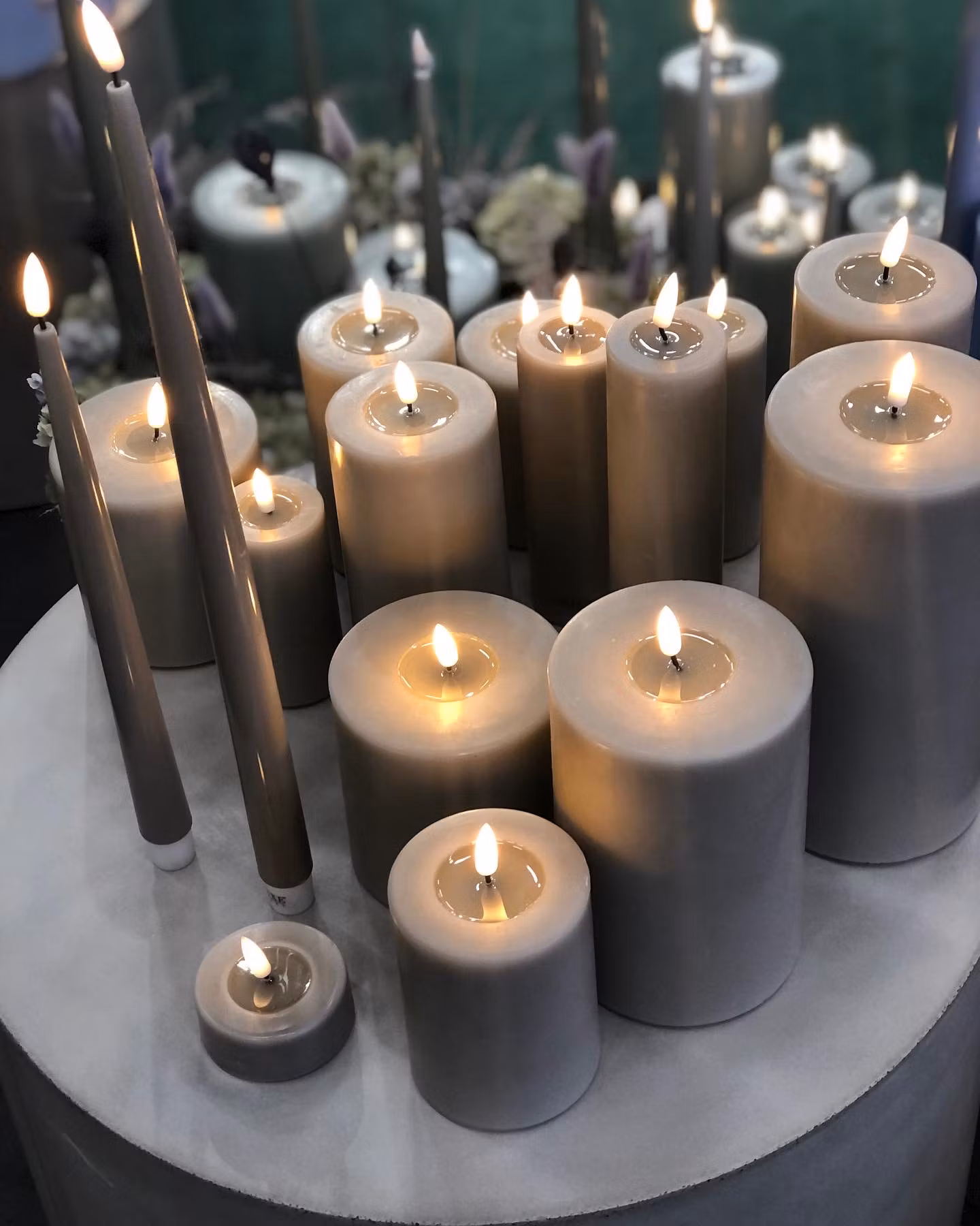 Batteriljus som ser väldigt äkta ut då lågan är äkta och det ser ut som smält stearin på ljusen. Färgen är gråbeige