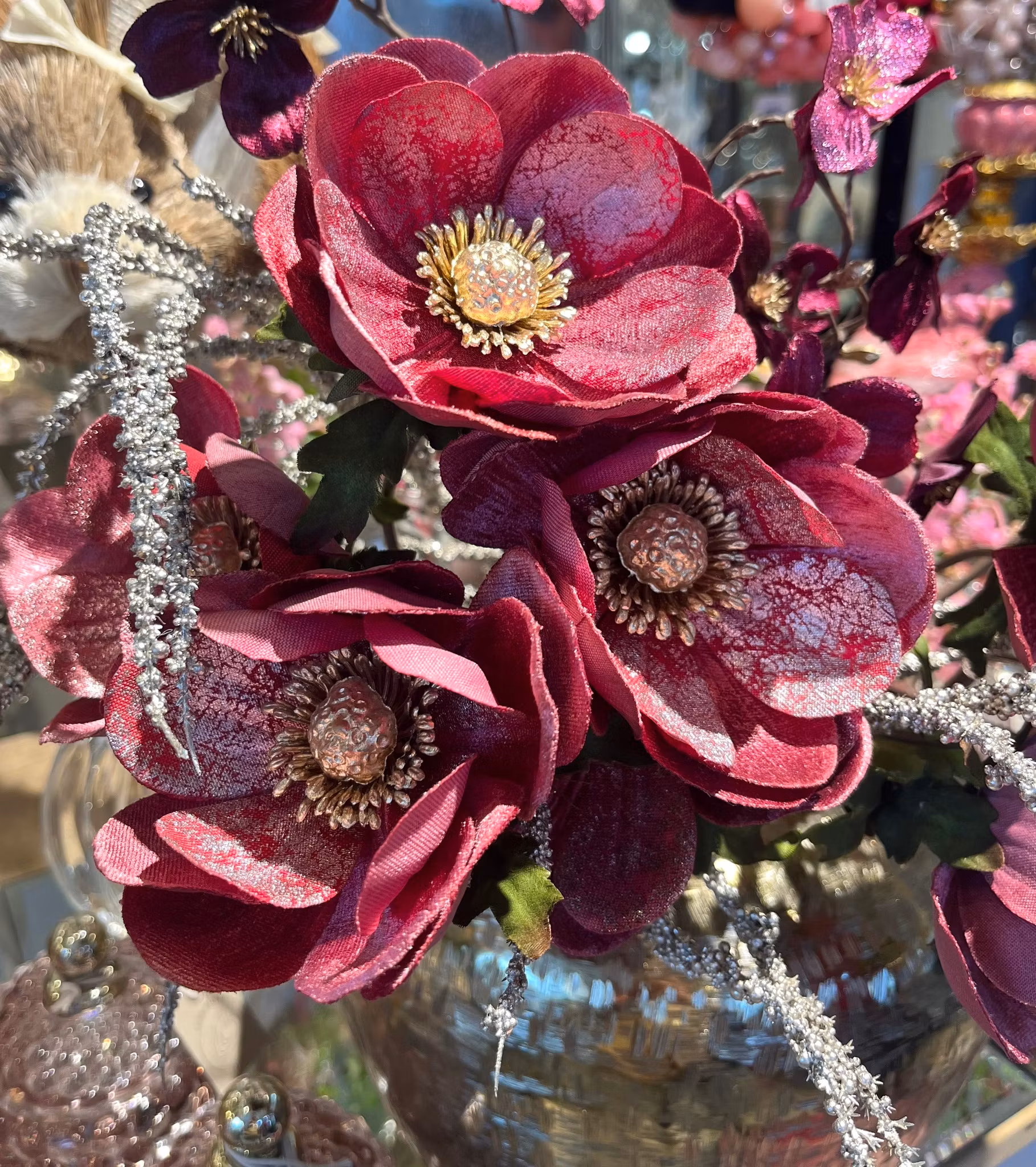 Jättefina blommor på kvist. Lika snygga i en vas som i julgranen. Grenen är 80cm lång med 3 blommor (kan behöva böjas lätt när vi skickar) Endast mellanrosa (bild 2) kvar