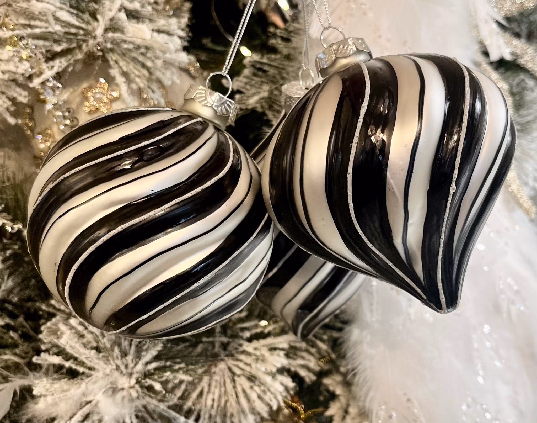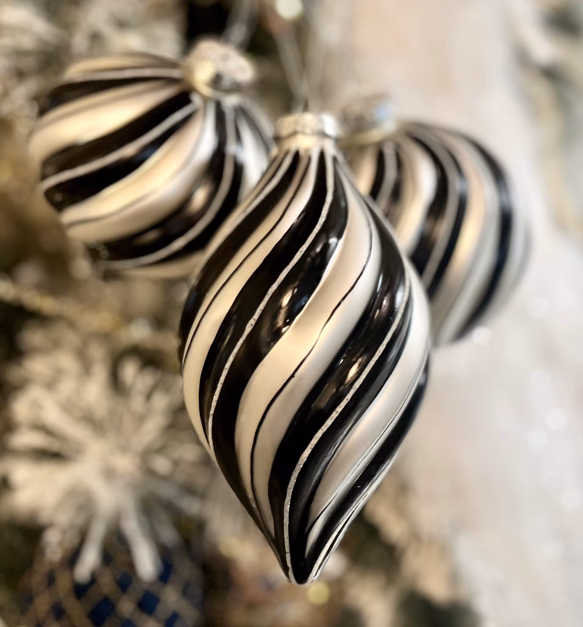 Hem › Julsaker › Hängande pynt/till julgranen › Julkula ribbad svart Julkula ribbad svart I lager. Vilken Rund Onion Drop 0 kr 99 kr Jättefina julkulor i svart och pärlemorvitt. Rund 10cm i diameter, Onion 10x11cm, Drop 15cm