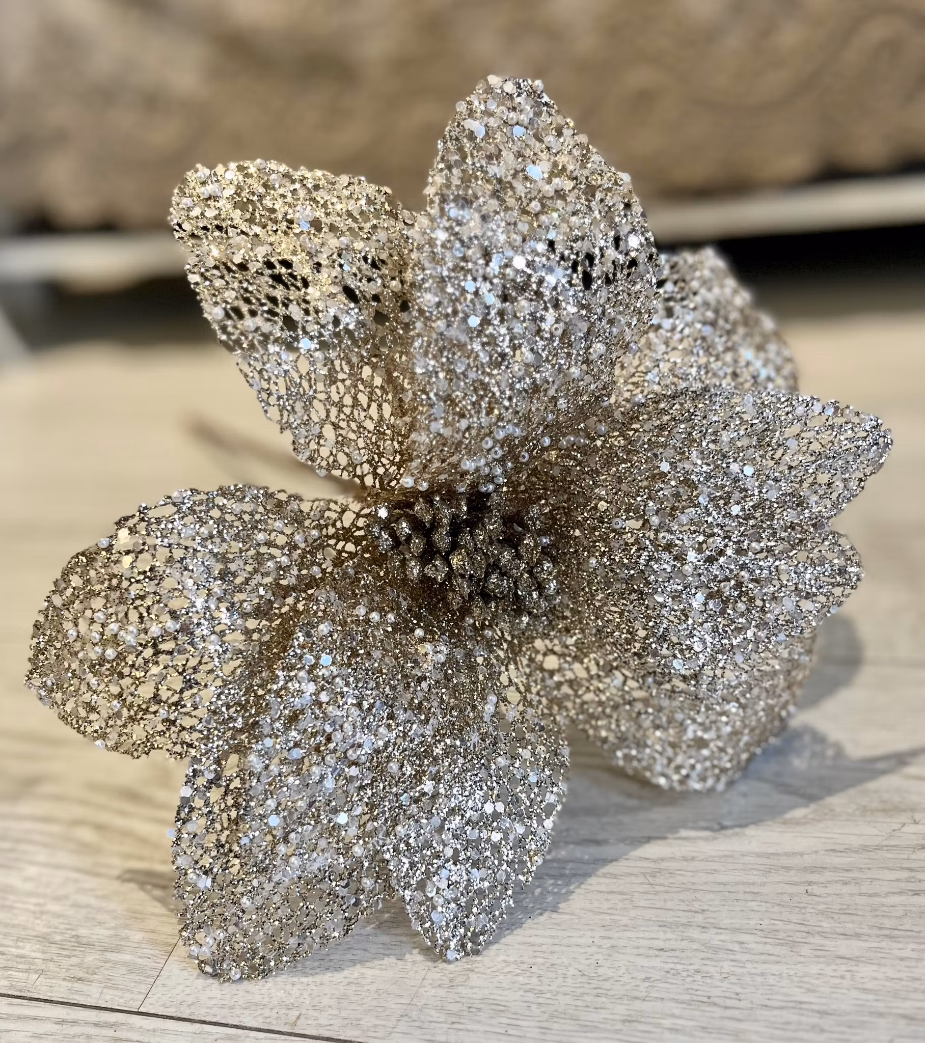 Jättefin superglittrig blomma i guld med pärlor. Bladen är helt böjbara och rak pinne att sticka in i gran eller arrangemang. 30cm i diameter