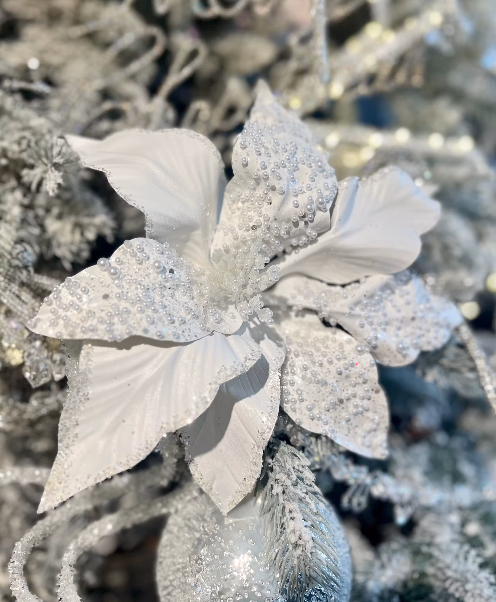 Hem › Julsaker › Hängande pynt/till julgranen › Poinsettia vit med pärlor Poinsettia vit med pärlor I lager. 0 kr 159 kr Jättefin blomma i vitt med pärlor och böjbara blad. Clips som kan sättas in i granen eller annat. ca 27cm i diameter