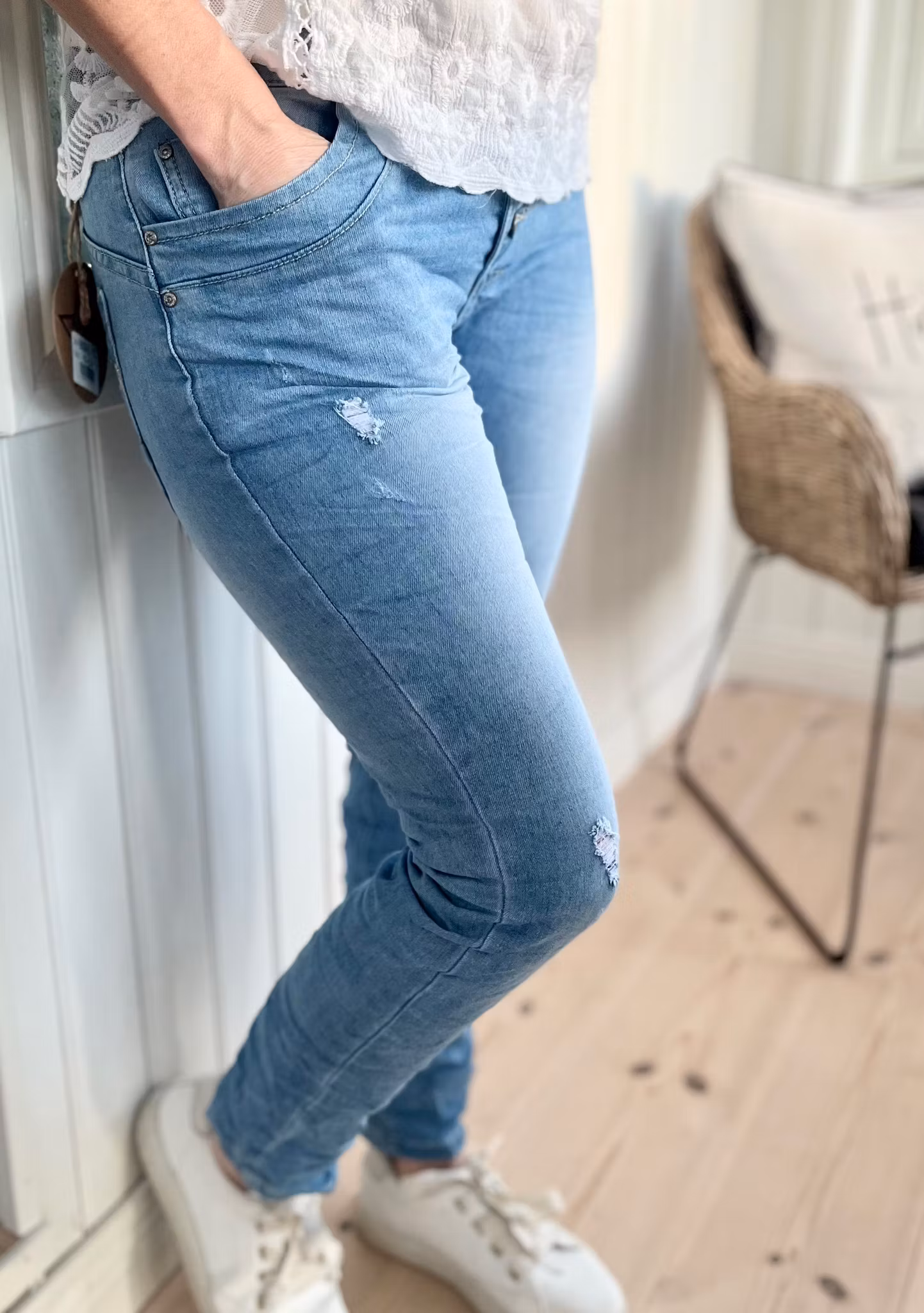Jättesköna superstretchiga jeans. Normala till små i storleken. Ljusa i färgen med lite snygga slitningar på framsidan