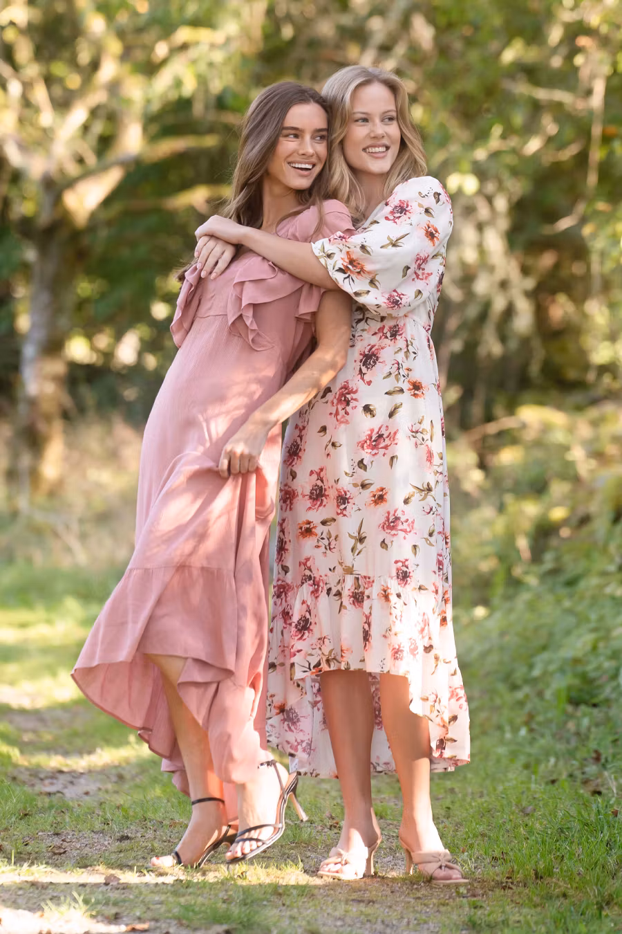 Vacker och feminin klänning med två lager trendiga vertikala volanger över bysten och på ryggen. Klänningen är v-ringad både fram och bak, med knytband och toffsar i nacken som ger en justerbar och dekorativ detalj. Midjan är avskuren med resår baktill för bästa passform, och kjoldelen är lätt utställd med en bred, rundad volang i nederkant som skapar rörelse och elegans. Ärmarna är designade i fjärilsmodell och harmonierar perfekt med volangerna upptill, vilket ger en mjuk och romantisk siluett.