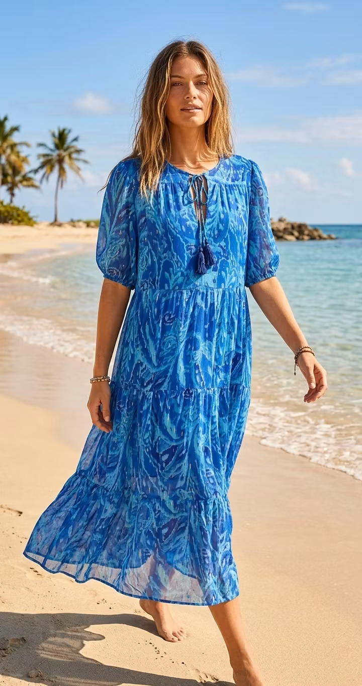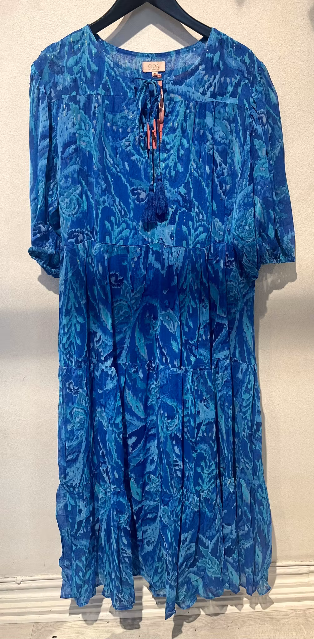 Jättehärlig klänning med guldtrådar i tyget. Underklänning 100% viskos, överklänning 100% polyester