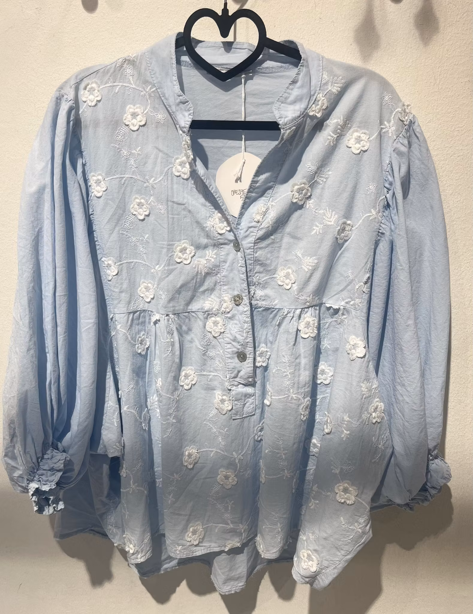 Härlig blus i 100% bomull med broderat blom-mönster på framsidan och 3 knappar i halsen. Resår på ärmsluten. Onesize som mäter ca 68cm från armhåla till armhåla