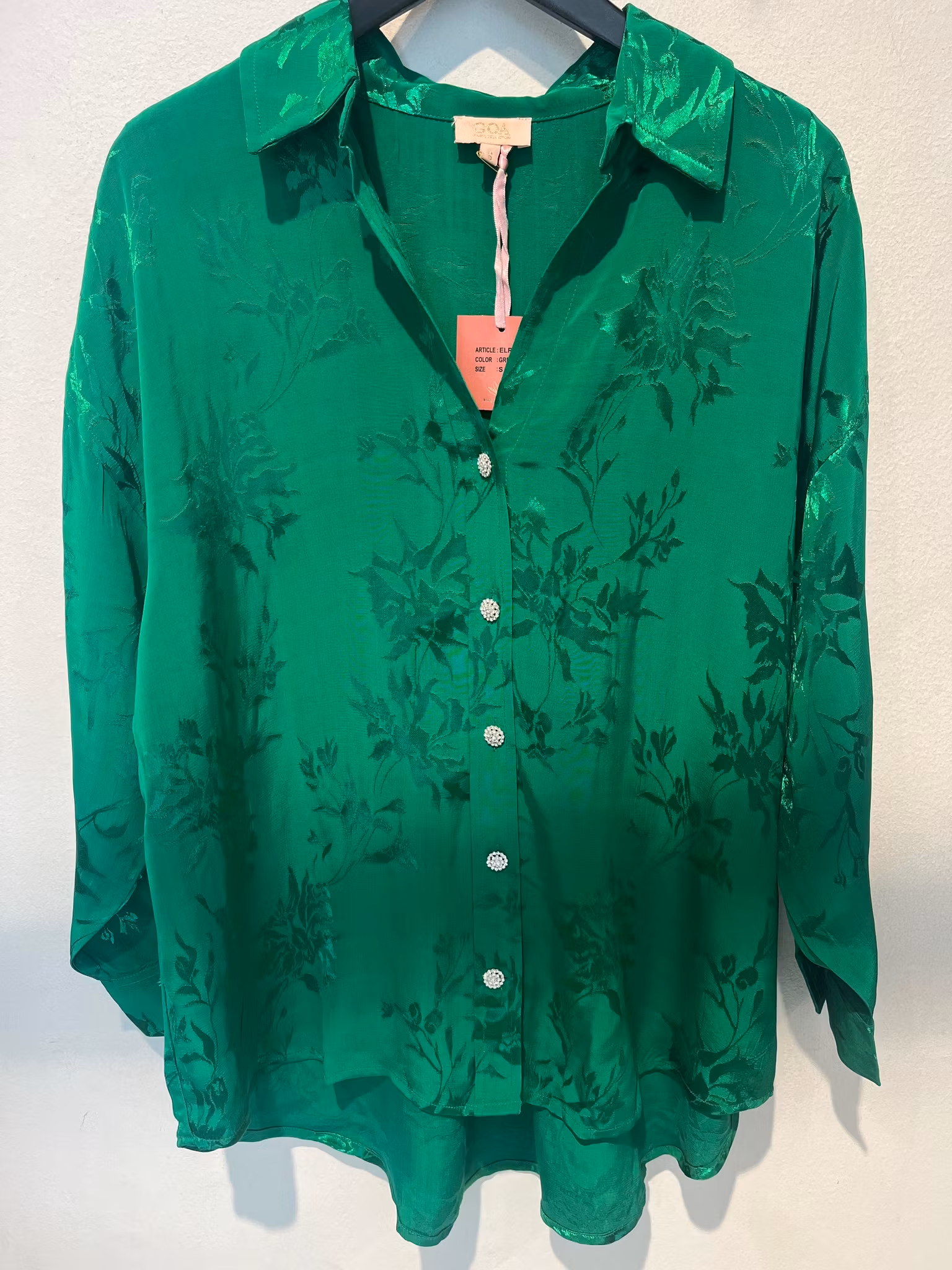 Jättesnygg lyxig blus i 100% viskos med sytt mönster och diamantknappar framtill och på ärmarna. Blusen är lite längre baktill
