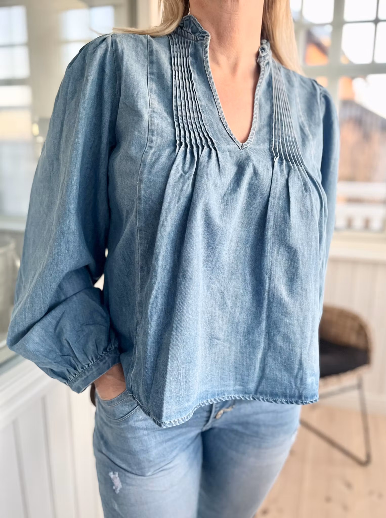 Hem › Kläder › Överdelar › Jeansblus Jeansblus I lager. Storlek Small Medium Large 0 kr 549 kr Jättefin jeansblus med snygga detaljer och fin färg. Jättemjukt jeanstyg i 100% bomull Stl S = bystmått ca 51cm, M = 53cm, L = 55cm