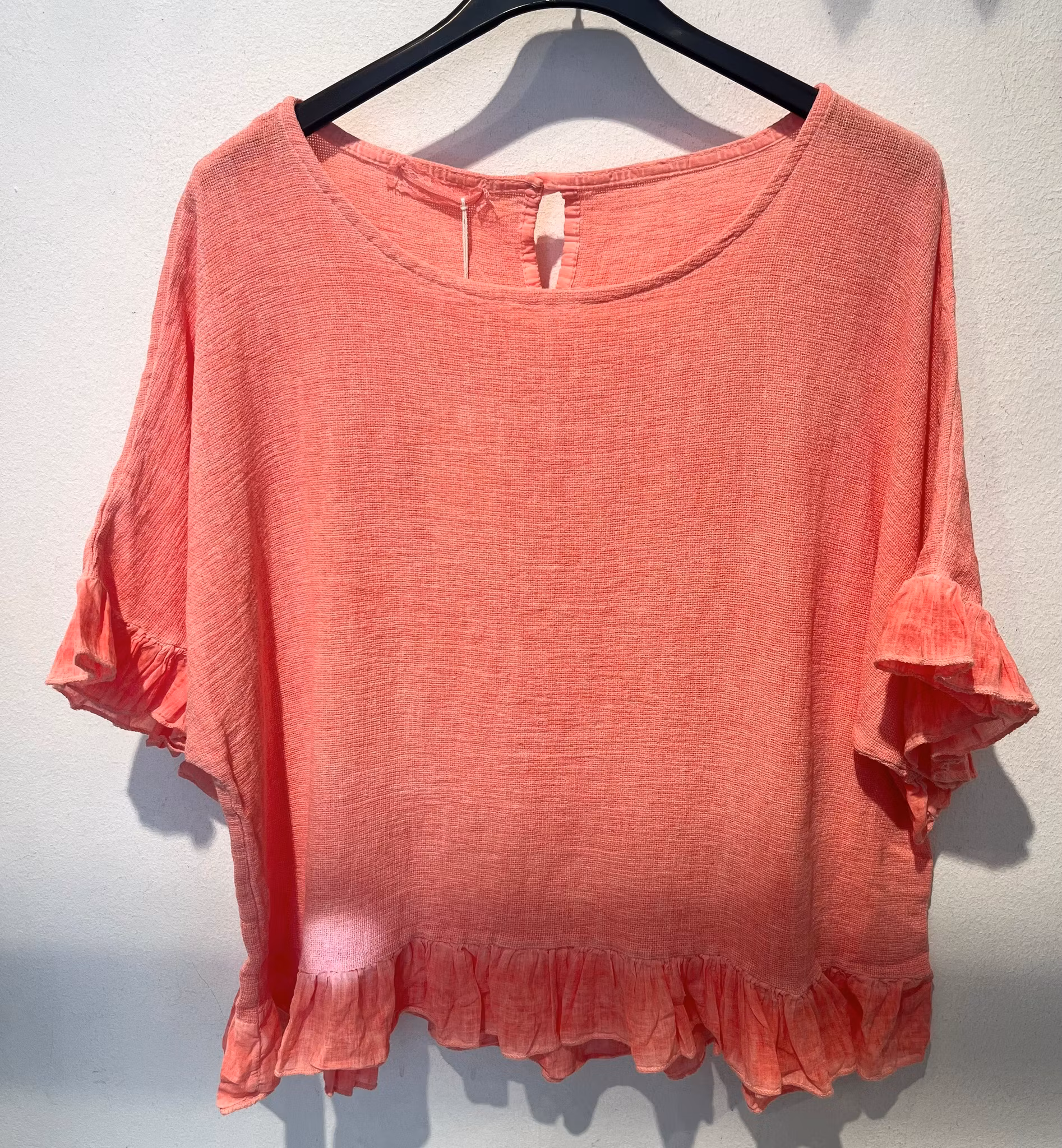 Jättehärlig blus med volang nedtill och på ärmarna. Lite längre bak. 50% linne och 50% bomull. Onesize som passar de flesta eftersom den är vid i modellen. Bystmått från armhåla till armhåla är ca 65cm