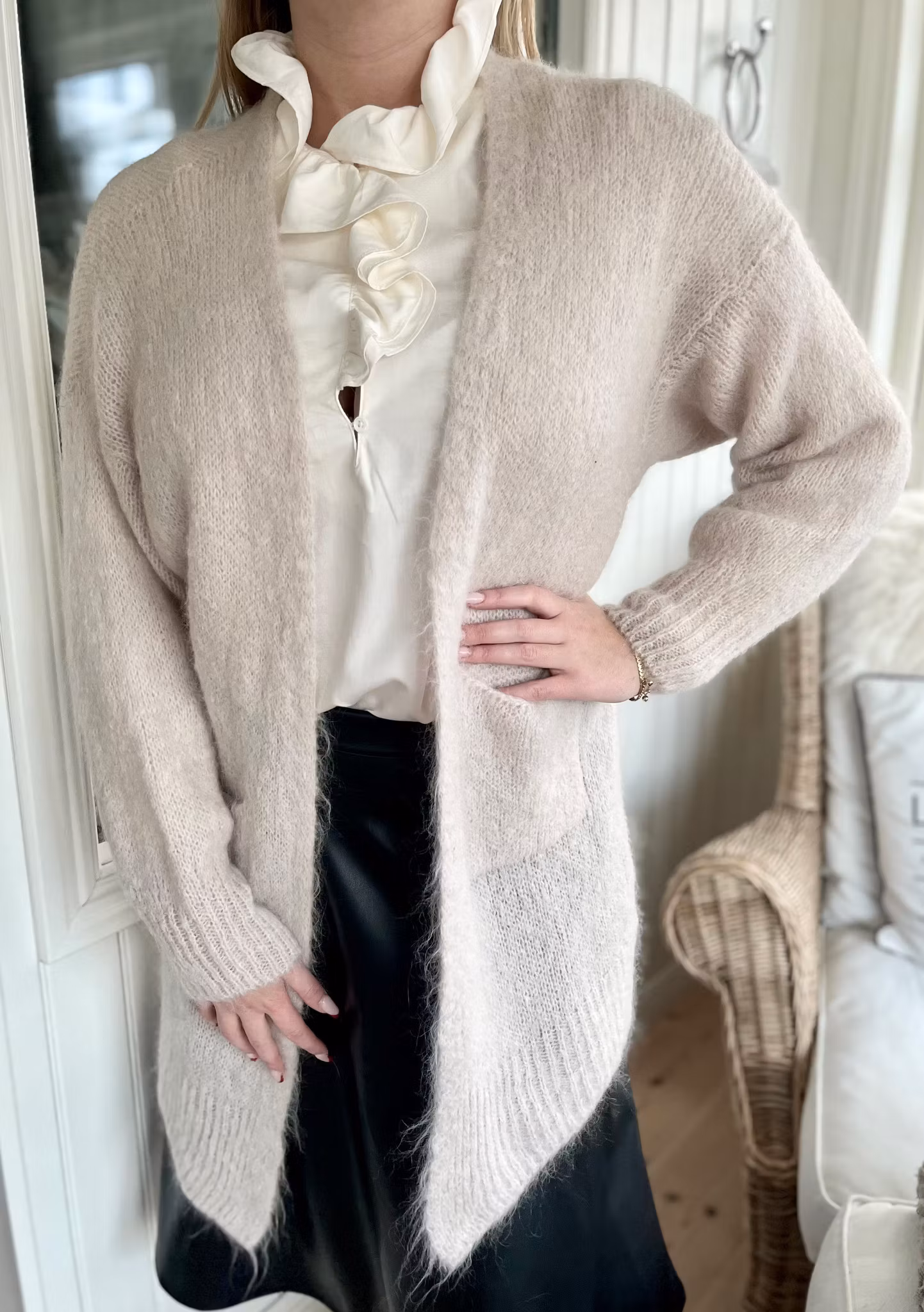 Hem › Kläder › Stickat/cardigan › Cardigan beige mohair Cardigan beige mohair I lager. 0 kr 995 kr Jättehärlig luddig cardigan i onesize. 40% mohair, 28% akryl, 22% polyamid, 10% ull