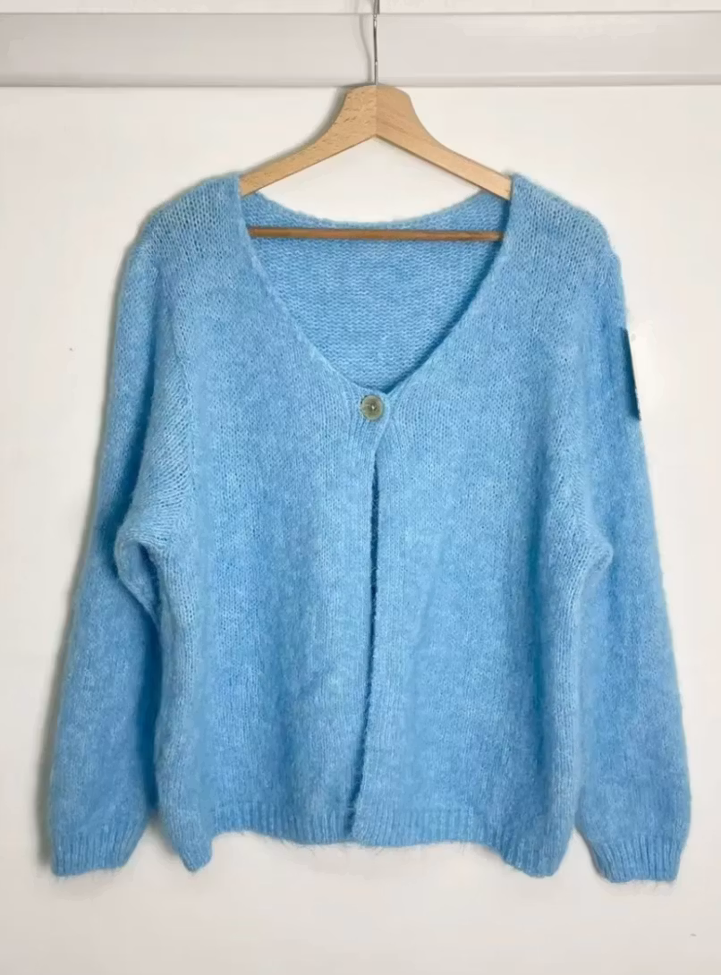 Hem › Kläder › Stickat/cardigan › Cardigan Riley ljusblå Cardigan Riley ljusblå I lager. 0 kr 399 kr Härlig stickad tröja i onesize som passar de flesta. 46% polyester, 20% ull, 20% nylon, 10% alpaca, 4% spandex