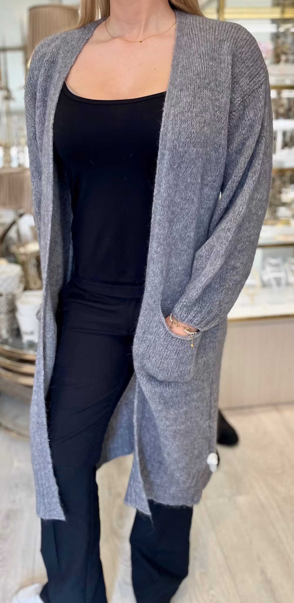 Hem › Kläder › Stickat/cardigan › Lång cardigan grå Lång cardigan grå I lager. 0 kr 995 kr Jättehärlig lång luddig cardigan i Onesize30% alpaca, 12% polyamid, 58% akryl