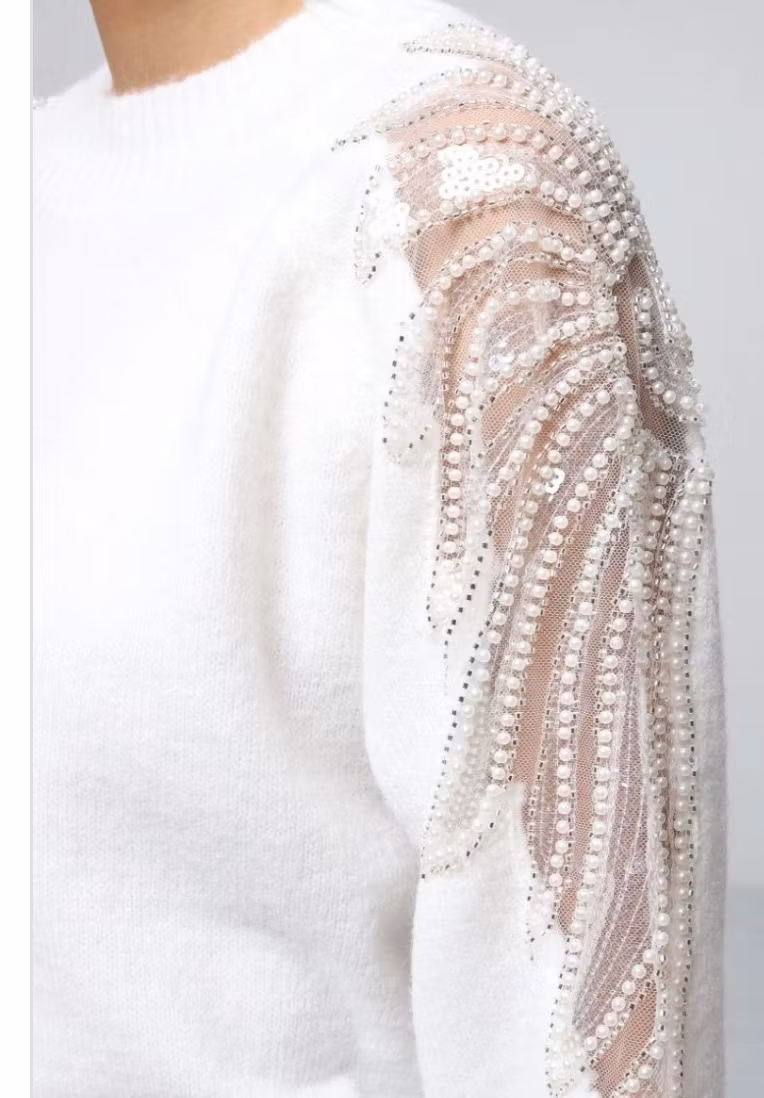Jättefin tröja i offwhite med dekorationer av pärlor och paljetter över hela axeln och ner på ärmen. Onesize stretchig med smalare modell.