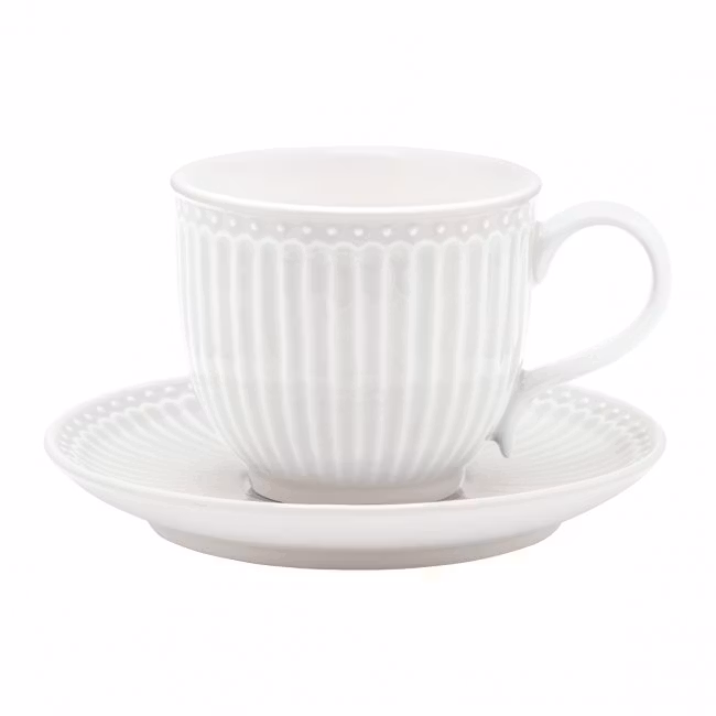 Hem › Kök/porslin › Greengate porslin › Greengate Cup & saucer Alice white Greengate Cup & saucer Alice white I lager. 0 kr 199 kr Set med kopp och fat i vitt porslin. Koppen är ca 8cm hög och fatet 15cm i diameter